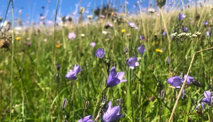 Harebells flowering in grassland in the foreground and a blue clear sky showing in the background ©Margery Thomas