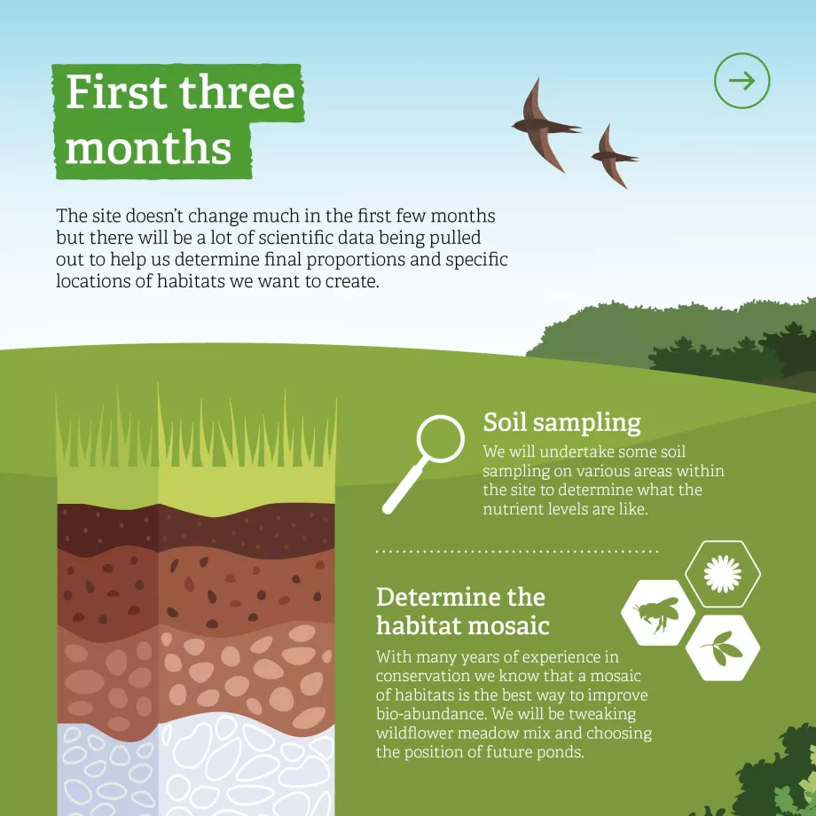 In the next 10-15 years, the site will truly begin to develop and mature. We’ll begin to see a much more established habitat used by lots of wildlife and without much physical intervention from humans. Of course, it would be difficult to predict what species will be there as we let nature take its own course though we expect an increase in chalk downland butterflies, birds (such as turtle doves), reptiles and pond-based creatures such as, amphibians and dragonflies too. Our evidence and monitoring team will continue to keep an eye on the site with management surveys which are a system of surveys we use across key reserves to ensure that the plans for the site are on track and if they’re not, what needs to change in the management plan to adapt and continue to improve biodiversity.