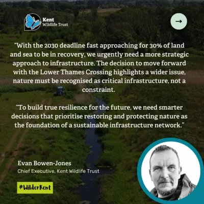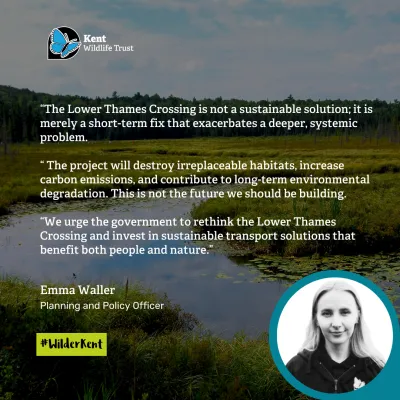 Planning & Policy Officer for Kent Wildlife Trust, Emma Waller, says: “We are profoundly disappointed by the government's approval of the Lower Thames Crossing, viewing it as a short-sighted scheme that poses significant threats to both climate and nature.