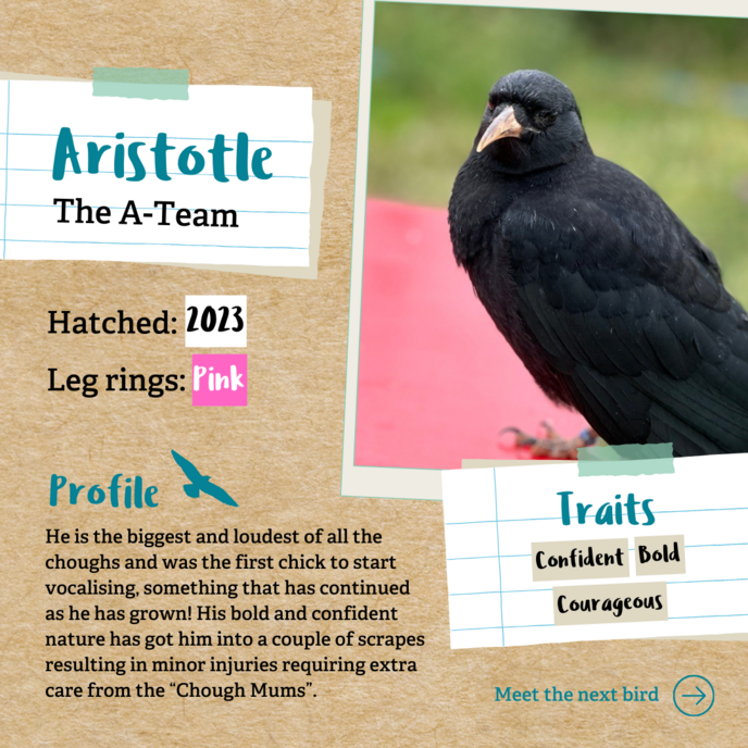 Staff named him Aristotle because of how much he talks, although you probably wouldn’t want to follow his philosophies. His bold and confident nature has got him into a couple of scrapes resulting in minor injuries requiring extra care from the “Chough Mums." Despite this, he continues to explore courageously.