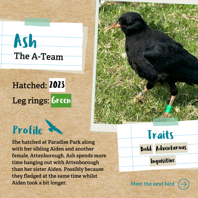 Ash is a hand-reared female who sports two green-leg rings. She hatched at Paradise Park along with her sibling Aiden and another female Attenborough. Ash spends more time hanging out with Attenborough than her sister Aiden. Possibly because they fledged at the same time whilst Aiden took a bit longer.