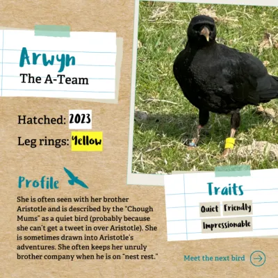 Arwyn hatched at Wildwood Trust, and can be identified by her two yellow leg rings. She is often seen with her brother Aristotle and is described by the “Chough Mums” as a quiet bird (probably because she can’t get a tweet in over Aristotle). She is sometimes drawn into Aristotle’s adventures. Unlike him, she has never been injured but often keeps her unruly brother company when he is on “nest rest.” Staff joke that this is when they become ‘grounded teenagers’.