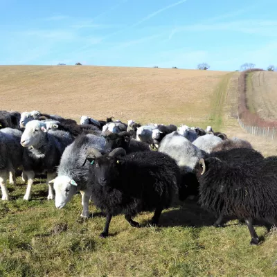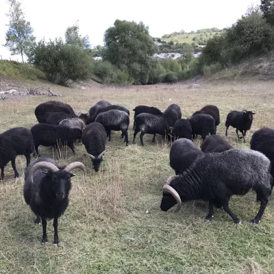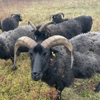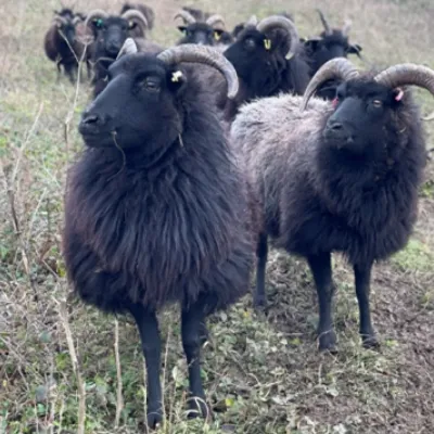 An all-black compact mountain sheep with a taste for bramble and young scrub. Both the males and females have horns, although the males' horns tend to be wider and longer, creating an attractive curl, rather than the backward sweep of the females'.