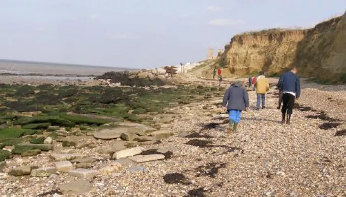 Discover the geological materials used in buildings and shore defences around Reculver and examine a classic coastal cliff section.