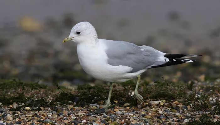 Gulls can be very difficult to tell apart, especially immature birds. Common gulls are silvery-grey above and white below, with a white head (streaky during the winter) and black wingtips. They are smaller than the similar herring gull, and have greenish-yellow legs and a yellow bill.