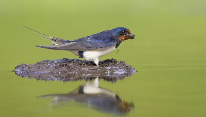 The swallow, or 'barn swallow', is a common summer visitor, arriving in April and leaving in October. It builds mud and straw nests on ledges, often in farm buildings and outhouses, or under the eaves of houses. Swallows are widespread and common birds of farmland and open pasture near water. They are agile fliers, feeding on flying insects while on the wing. Before they migrate back to their wintering grounds in Africa, they can be seen gathering to roost in wetlands, particularly reedbeds.