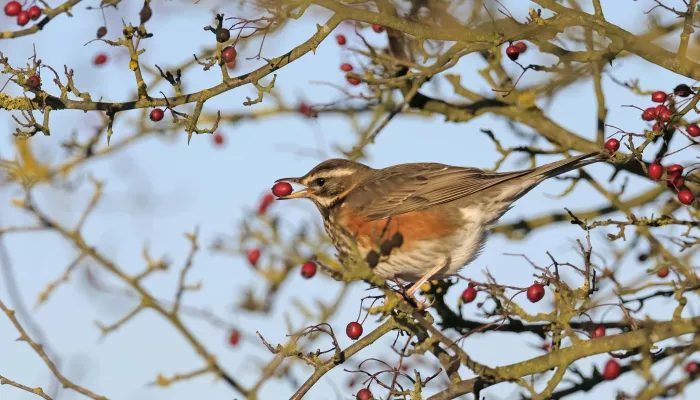 The redwing is a winter visitor, enjoying the feast of seasonal berries the UK's hedgerows, gardens and parks have to offer. Look out for the distinctive orangey-red patches under its wings.