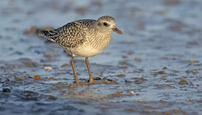 The grey plover is similar to the golden plover, but is bigger and greyer, with a sturdier black bill and long black legs. It has a spotted, white and silvery-grey back, and pale grey and white underparts. In spring, adults sport a black throat, chest and belly as they make their way north to their breeding grounds.