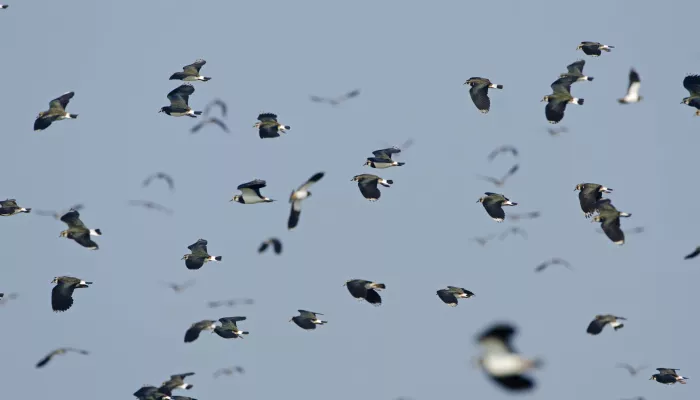 The distinctive rounded wings of the lapwing are displayed beautifully when it wheels around a winter sky in a massive flock. In spring, these flocks disperse and some birds breed in the UK. Listen out for their 'peewit' calls on grasslands and wetlands.