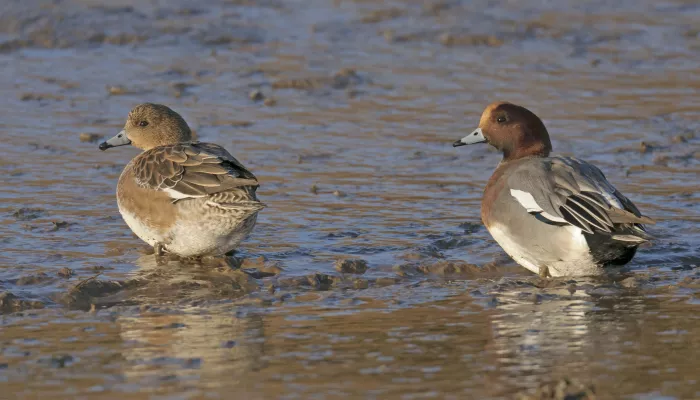 The wigeon is a medium-sized duck with a round head and short bill. Males are grey with a pink breast, orange head, yellow forehead and obvious white wing patches that can be seen when they fly. Females are similar to mallard females, but with rusty brown plumage and a pointed tail.