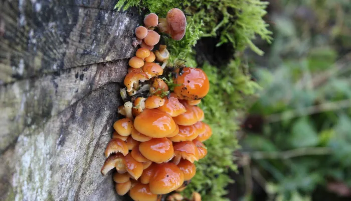 The velvet shank can be found clustered on the dead and dying wood of deciduous trees, such as elm, ash, beech or oak. It has a bright orange cap and can be seen throughout winter.