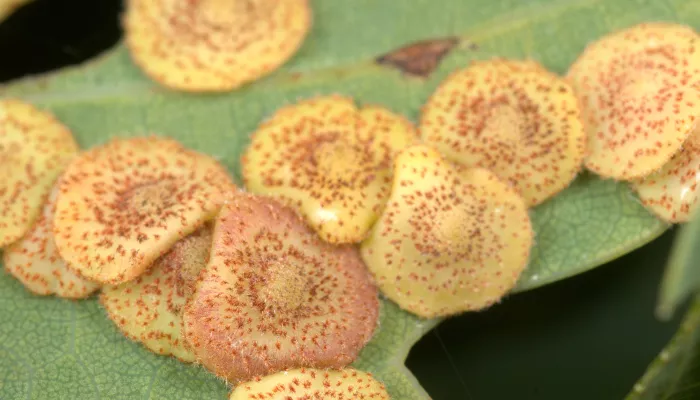 The common spangle gall wasp produces a small, disc-shaped growth, or 'gall', on the undersides of oak leaves. Inside the gall, the larvae of the wasp feed on the host tissues, but cause little damage.