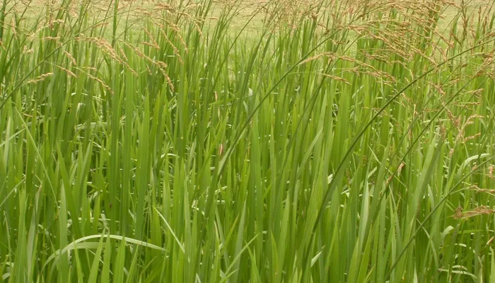 Reed sweet-grass is a tall grass with large, loose flower heads that are much branched and have narrow spikelets that contain the flowers. Its leaves are long and bright green.