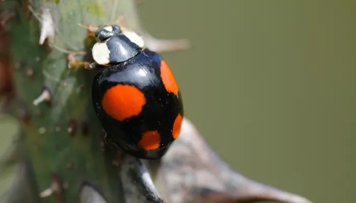 In North America, the harlequin ladybird is sometimes known as the 'Halloween bug' because it gathers together in enormous numbers during the late autumn, sometimes invading people's homes. This Asian ladybird was introduced into North America to control aphids, but has spread so successfully over the past 25 years that it is now the commonest ladybird there and is seriously threatening endemic species of ladybird.