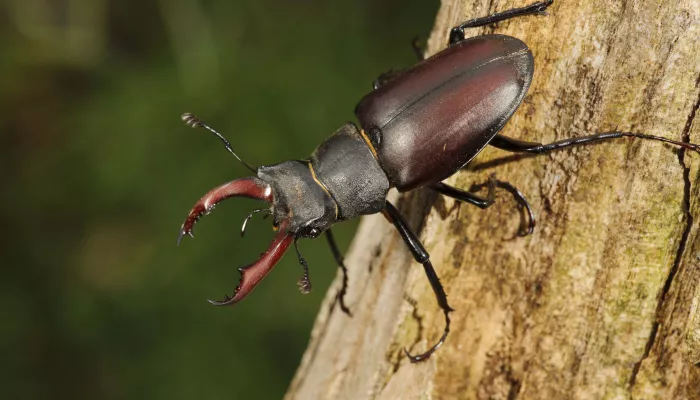 Famous for its fearsome jaws, the stag beetle does not have the bite to match. Look for it in woods, parks and gardens in South East England in summer. Males display their massive jaws to attract females and duel with their rivals.