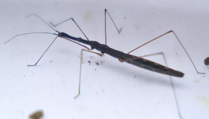 The Common water-measurer is a long-legged, thin, brown bug that lives on the surface of the water and around the edges of ponds and marshes. A scavenger and a hunter, it feeds on small insects that float to the surface, whether dead or alive. It is very sensitive to vibrations on the surface of the water, using them as a way to locate prey such as mosquito larvae. It spears its prey with its mouthparts and sucks the contents out of the body.