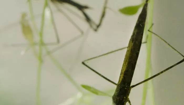 An underwater predator, and a relative of the water scorpion, the water stick Insect hides among reeds and stems in lakes and ponds. Here, it waits, perfectly camouflaged, ready to ambush its prey. It adopts a mantis-like pose when submerged, capturing passing creatures like tadpoles and small fish. Like the water scorpion, the water stick Insect uses its long, thin 'tail' as a siphon for breathing: it protrudes above the water's surface and acts just like a snorkel. Mating occurs in spring and the eggs are laid soon after on floating plants and stems. Nymphs go through a series of moults to reach adulthood.