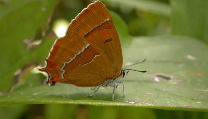 The brown hairstreak is a large hairstreak, with brown upperwings and small 'tails' protruding from the hindwings. Females have a brilliant orange patch in the top corner of each forewing. The underwings are a distinctive bright orange, with two white lines streaked across them.