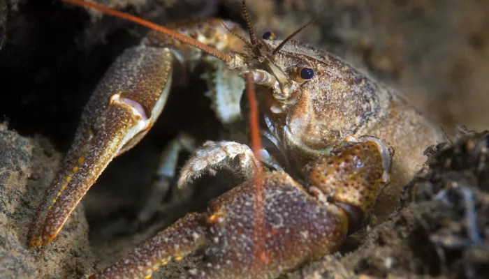 The White-clawed crayfish is a freshwater, bronze-coloured crustacean with pale undersides to its claws - hence the name. It is under threat from an invasive and introduced species of crayfish.