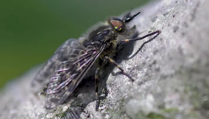 The Notch-horned cleg-fly is dark grey in colour, with grey-brown mottled wings and intricately striped, iridescent eyes. There are 30 species of horse-fly in the UK; this is one of the most frequently encountered species and also one of the smaller ones.