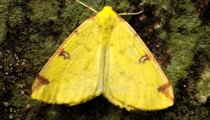 The brimstone moth is bright yellow; it has white spots edged with brown and two orangey-brown markings along the front edges of its forewings. The wings are quite angular in appearance. There are several other yellow moths with brown markings: if seen well, the brimstone moth can be distinguished by its white spot.