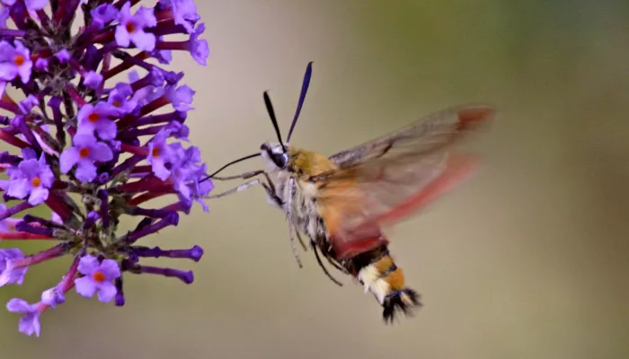 The broad-bordered bee hawk-moth does like a bit like a bumblebee. It has reddish-brown bands across its golden abdomen that can change to black as the hairs wear off. It also has reddish bands on its translucent forewings and long, clubbed antennae.