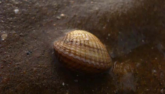 The common cockle lives on muddy and sandy shores, between the high tide and low tide mark, and is commonly found in estuaries. It is a medium-sized clam-like shell, rounded and domed with radiating ridges. It feeds by filtering plankton and other organic matter from the water. Cockles are an important food source for shorebirds such as oystercatchers, the shore crab and flatfish.