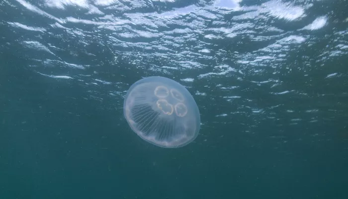 A round, dome-shaped jelly, translucent with four purple circular markings around the centre. You can usually see these jellyfish floating just below the surface of the water.