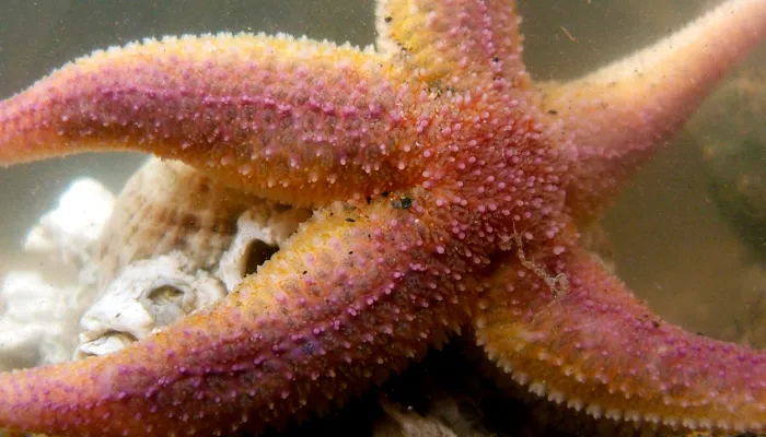 The common starfish is highly common in UK seas, found in rockpools and out at sea to depths of at least 600m. They are active predators, feasting on bivalves such as mussels and clams. As such, they have been known to become a bit of a pest on mussel and oyster beds! Starfish feed on shellfish by pulling the shells open with their arms, inserting their own stomach into the shell and dissolving their prey with digestive juices, before reabsorbing their stomach full of the shellfish soup.Starfish will form huge aggregations when food is plentiful, drawn in by their keen sense of smell. They don't have a nose - they use special receptors in their skin!. Starfish aren't really fish, they are a type of sea creature called an echinoderm, which means "spiny skinned". Echinoderms includes starfish, sea urchins, sea cucumbers and brittlestars.