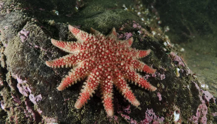 The common sunstar is a type of starfish, with 10-12 short arms that look like sun rays. It has an orangey-red disc (the centre) with beautiful concentric bands of yellow, orange, pink or white. The sunstar is an echinoderm - which means "spiny skinned" and it lives up to the name as it is covered in small spines. It lives on the seabed in shallow waters close to the shore as well as down to depths of 50m. Small sunstars are sometimes found in rockpools, so keep an eye out next time you're at the beach.