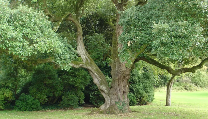 The Holm oak is an evergreen oak tree. It has dark, glossy leaves that are oval and concave in shape, and spiny on younger trees or new shoots.