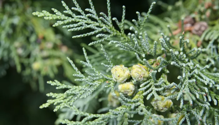 The Lawson cypress has small, scale-like leaves that cover its green twigs. Left alone, a mature tree will become tall and conical in shape, but they are often pruned down in gardens and parks.