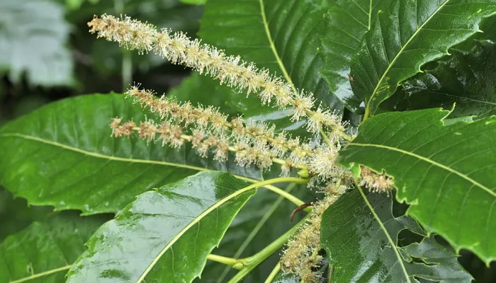The sweet chestnut has long leaves with large teeth along their edges, and soft-spined fruit cases that contain two or three chestnuts.