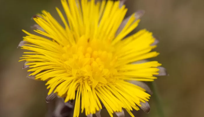 A common and creeping perennial of bare, damp or disturbed ground, Colt's-foot can be found on waste ground, field edges and roadside verges. Sun-yellow, daisy-like, composite flower heads (made up to lots of tiny flowers) appear as early as February, and well before the hoof-shaped leaves (hence the common name). Colt's-foot continues to brighten up rough ground until April.