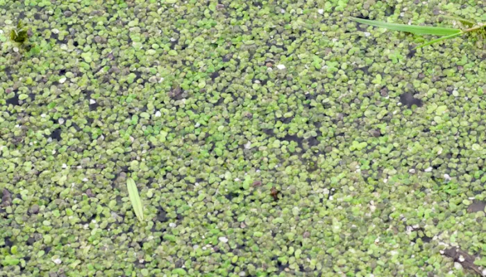 Each tiny, clover-like 'leaf' of Common duckweed has a single root that hangs in the water and is actually an entire plant - this simple structure is called a 'thallus'. Many of these tiny plants are packed closely together to create the yellow-green 'lawn' often seen on the water's surface.