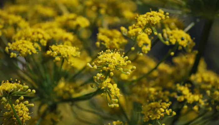 Fennel has grey-green foliage with thread-like leaves that smell of aniseed. Its loose umbels of yellow flowers appear at the ends of branched stems.
