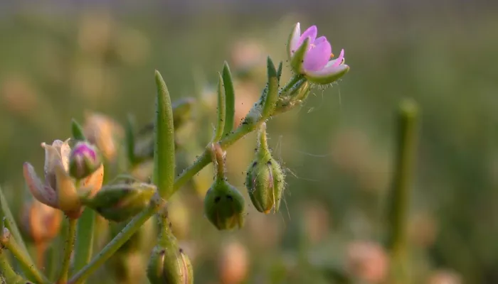 Lesser sea-spurrey has fleshy, cylindrical, green leaves and small, deep pink flowers with white middles. It is a low growing, sprawling plant.