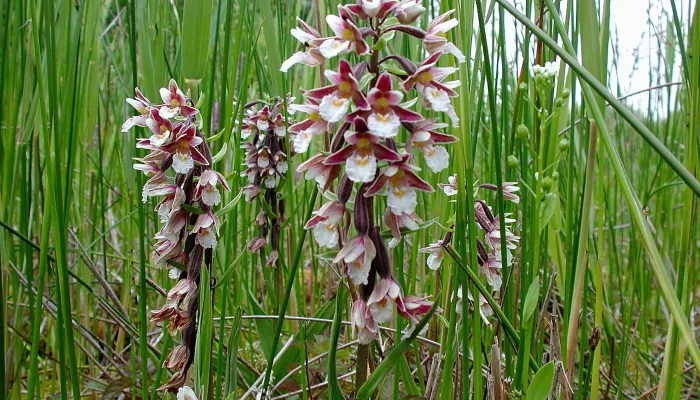 A stunning orchid of wetland areas, the Marsh helleborine can be found in fens, damp grassland, marshes and dune slacks, particularly on chalky soils. Its rather loose flower spike carries up to 20 white-and-pink flowers during July and August; in some areas, forests of hundreds of plants can colour the green marsh vegetation. But despite its profusion in places, the Marsh helleborine is declining due to habitat loss.