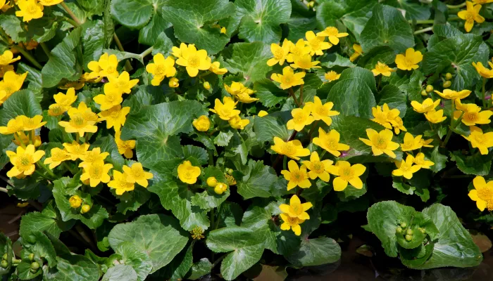 Marsh-marigold is a large buttercup-like flower that grows in wet places. It has very large, rounded, scalloped leaves.