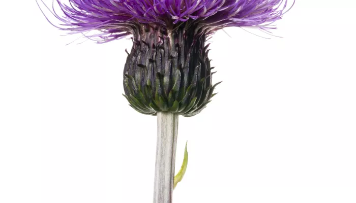 The tall Melancholy thistle displays solitary flower heads of red-purple florets (tiny flowers) surrounded by oval, purple-tinged bracts (leaf-like structures). Unlike other thistles, it doesn't have spines and its leaves have a dense white felt on their undersides.