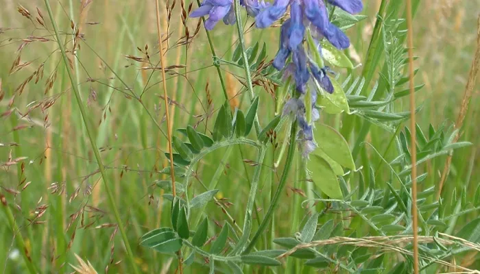 Tufted vetch, also known as 'Cow vetch' or 'Bird vetch', is a member of the pea and clover family (legumes). It lives happily in many different habitats, including woodland edges, scrubland, coastal margins and grassland, and can be seen climbing over hedges and banks. The spikes of bluish-violet flowers appear between June and August.