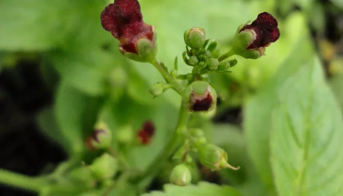 Water figwort has reddish, square stems and pointed, toothed leaves that are evergreen. Its flowers are deep maroon with two lips, and conspicuous green sepals that have brown edges; they are held in branches off the main stem and appear in whorls.