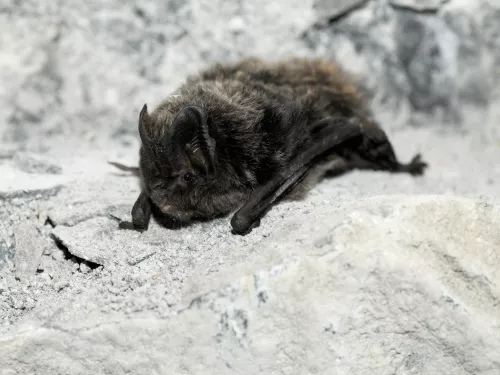 The barbastelle is a scarce bat that lives in woodland and forages over a wide area. It has a distinctive 'pug-like' appearance because of its upturned nose.
